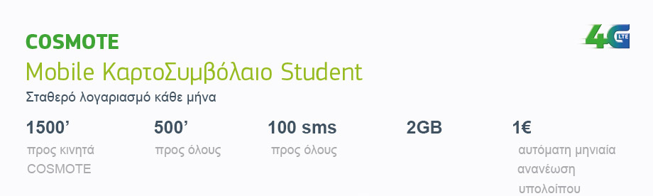 Για σένα που είσαι φοιτητής, το COSMOTE Mobile ΚαρτοΣυμβόλαιο Student σου δίνει όση ομιλία, SMS και MB χρειάζεσαι μόνο με 15,12€…και όλα αυτά με σταθερό λογαριασμό και πολλά extra!